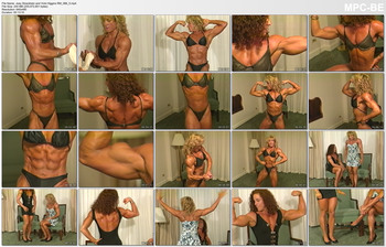 Vickie (New England) and Joey (northwest) come from opposite ends of the country and were also on opposite ends of the physique style here- Vickie was in near contest shape (larger, fuller shapes and lean), but Joey, who was doing a contest that weekend, was wiry lean and chiseled. Each thinks the best women are from their 'coast', so they pose solo and tandem in several outfits to try to determine who is 'best'. As far as we can remember, this is the only video appearance for either for any company.